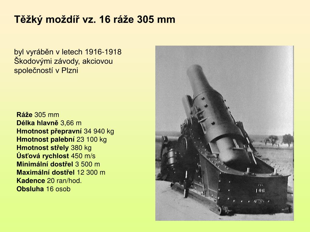 Těžký moždíř vz. 16 ráže 305 mm byl vyráběn v letech 1916-1918 Škodovými závody, akciovou společností v Plzni Ráže 305 mm Délka hlavně 3,66 m Hmotnost přepravní 34 940 kg Hmotnost palební 23 100 kg Hmotnost střely 380 kg Úsťová rychlost 450 m/s Minimální dostřel 3 500 m Maximální dostřel 12 300 m Kadence 20 ran/hod. Obsluha 16 osob