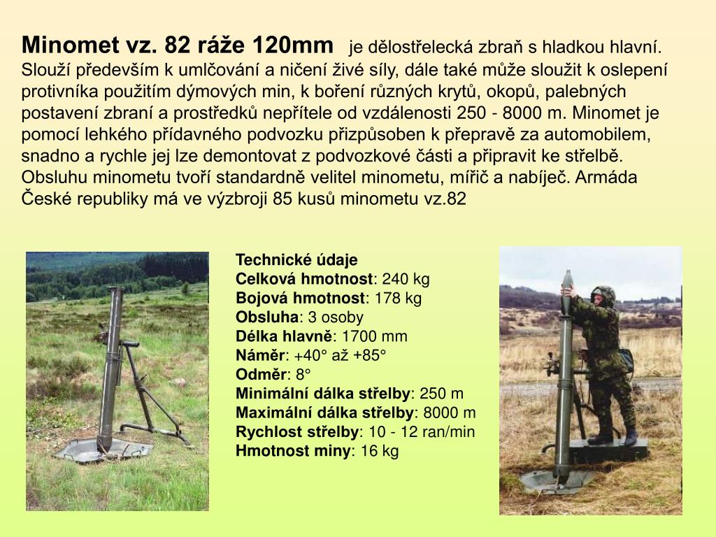 Minomet vz. 82 ráže 120mm je dělostřelecká zbraň s hladkou hlavní. Slouží především k umlčování a ničení živé síly, dále také může sloužit k oslepení protivníka použitím dýmových min, k boření různých krytů, okopů, palebných postavení zbraní a prostředků nepřítele od vzdálenosti 250 - 8000 m. Minomet je pomocí lehkého přídavného podvozku přizpůsoben k přepravě za automobilem, snadno a rychle jej lze demontovat z podvozkové části a připravit ke střelbě. Obsluhu minometu tvoří standardně velitel minometu, mířič a nabíječ. Armáda České republiky má ve výzbroji 85 kusů minometu vz.82 Technické údaje Celková hmotnost: 240 kg Bojová hmotnost: 178 kg Obsluha: 3 osoby Délka hlavně: 1700 mm Náměr: +40° až +85° Odměr: 8° Minimální dálka střelby: 250 m Maximální dálka střelby: 8000 m Rychlost střelby: 10 - 12 ran/min Hmotnost miny: 16 kg