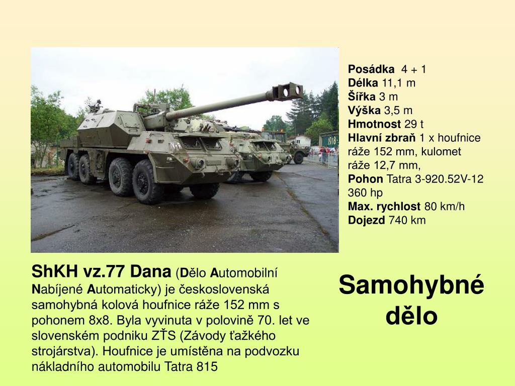 Posádka 4 + 1 Délka 11,1 m Šířka 3 m Výška 3,5 m Hmotnost 29 t Hlavní zbraň 1 x houfnice ráže 152 mm, kulomet ráže 12,7 mm, Pohon Tatra 3-920.52V-12360 hp Max. rychlost 80 km/h Dojezd 740 km ShKH vz.77 Dana (Dělo Automobilní Nabíjené Automaticky) je československá samohybná kolová houfnice ráže 152 mm s pohonem 8x8. Byla vyvinuta v polovině 70. let ve slovenském podniku ZŤS (Závody ťažkého strojárstva). Houfnice je umístěna na podvozku nákladního automobilu Tatra 815 Samohybné dělo