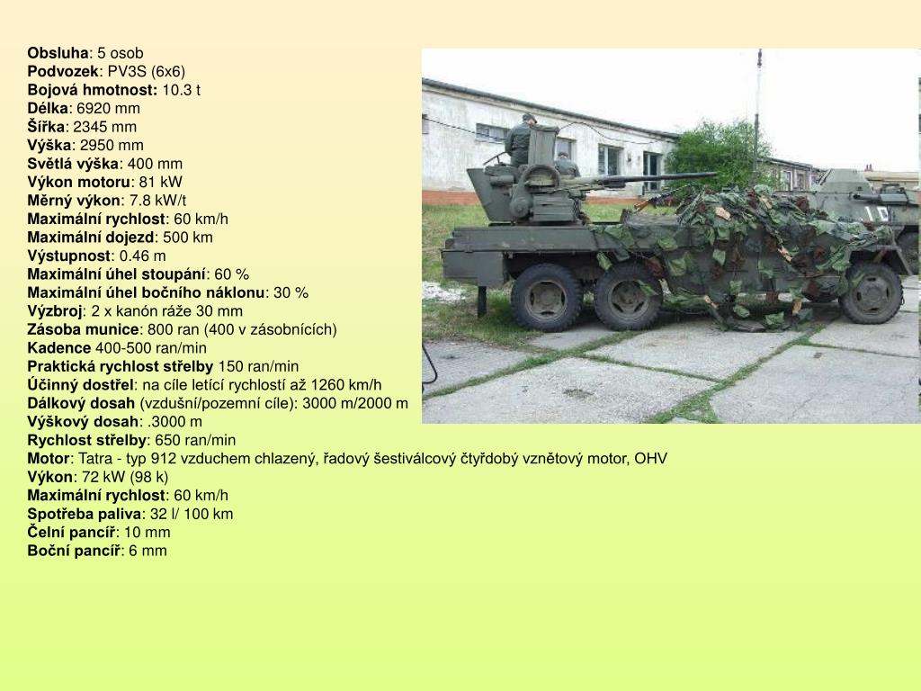 Obsluha: 5 osob Podvozek: PV3S (6x6) Bojová hmotnost: 10.3 t Délka: 6920 mm Šířka: 2345 mm Výška: 2950 mm Světlá výška: 400 mm Výkon motoru: 81 kW Měrný výkon: 7.8 kW/t Maximální rychlost: 60 km/h Maximální dojezd: 500 km Výstupnost: 0.46 m Maximální úhel stoupání: 60 % Maximální úhel bočního náklonu: 30 % Výzbroj: 2 x kanón ráže 30 mm Zásoba munice: 800 ran (400 v zásobnících) Kadence 400-500 ran/min Praktická rychlost střelby 150 ran/min Účinný dostřel: na cíle letící rychlostí až 1260 km/h Dálkový dosah (vzdušní/pozemní cíle): 3000 m/2000 m Výškový dosah: .3000 m Rychlost střelby: 650 ran/min Motor: Tatra - typ 912 vzduchem chlazený, řadový šestiválcový čtyřdobý vznětový motor, OHV Výkon: 72 kW (98 k) Maximální rychlost: 60 km/h Spotřeba paliva: 32 l/ 100 km Čelní pancíř: 10 mm Boční pancíř: 6 mm