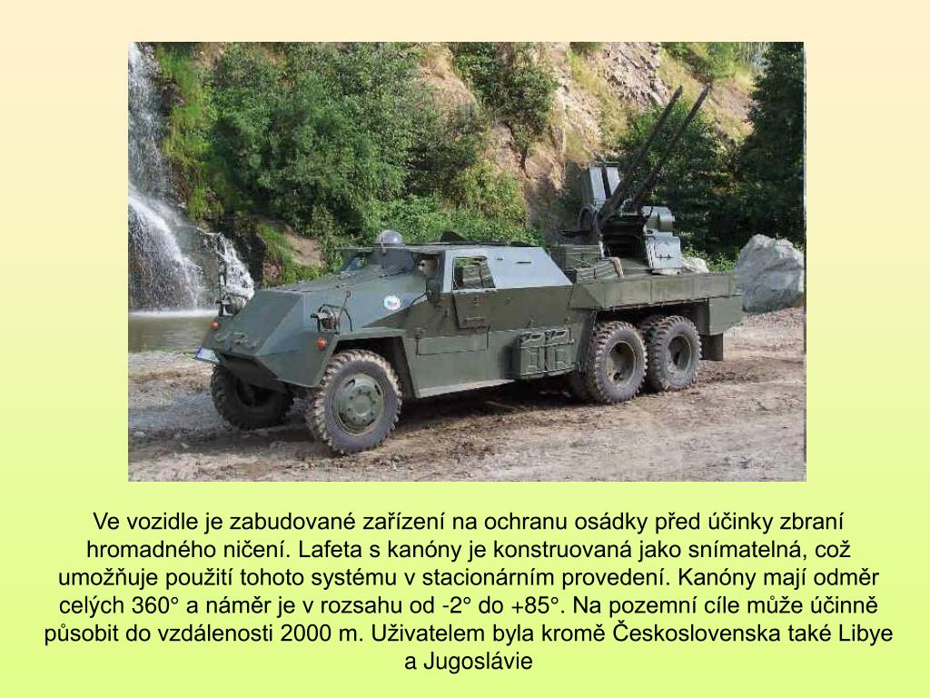 Ve vozidle je zabudované zařízení na ochranu osádky před účinky zbraní hromadného ničení. Lafeta s kanóny je konstruovaná jako snímatelná, což umožňuje použití tohoto systému v stacionárním provedení. Kanóny mají odměr celých 360° a náměr je v rozsahu od -2° do +85°. Na pozemní cíle může účinně působit do vzdálenosti 2000 m. Uživatelem byla kromě Československa také Libye a Jugoslávie