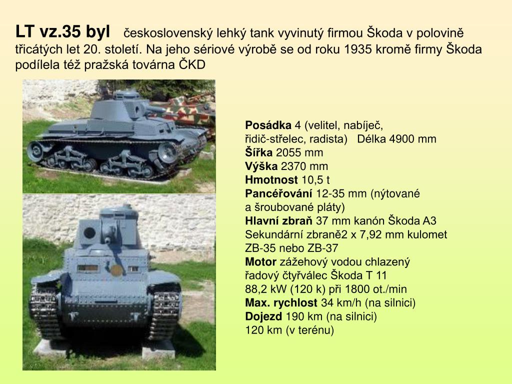 LT vz.35 byl československý lehký tank vyvinutý firmou Škoda v polovině třicátých let 20. století. Na jeho sériové výrobě se od roku 1935 kromě firmy Škoda podílela též pražská továrna ČKD Posádka 4 (velitel, nabíječ, řidič-střelec, radista) Délka 4900 mm Šířka 2055 mm Výška 2370 mm Hmotnost 10,5 t Pancéřování 12-35 mm (nýtované a šroubované pláty) Hlavní zbraň 37 mm kanón Škoda A3 Sekundární zbraně2 x 7,92 mm kulomet ZB-35 nebo ZB-37 Motor zážehový vodou chlazený řadový čtyřválec Škoda T 1188,2 kW (120 k) při 1800 ot./min Max. rychlost 34 km/h (na silnici) Dojezd 190 km (na silnici)120 km (v terénu)