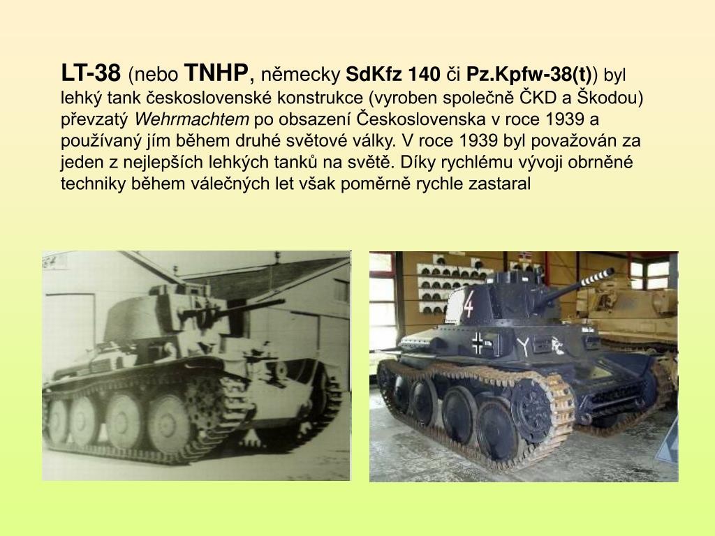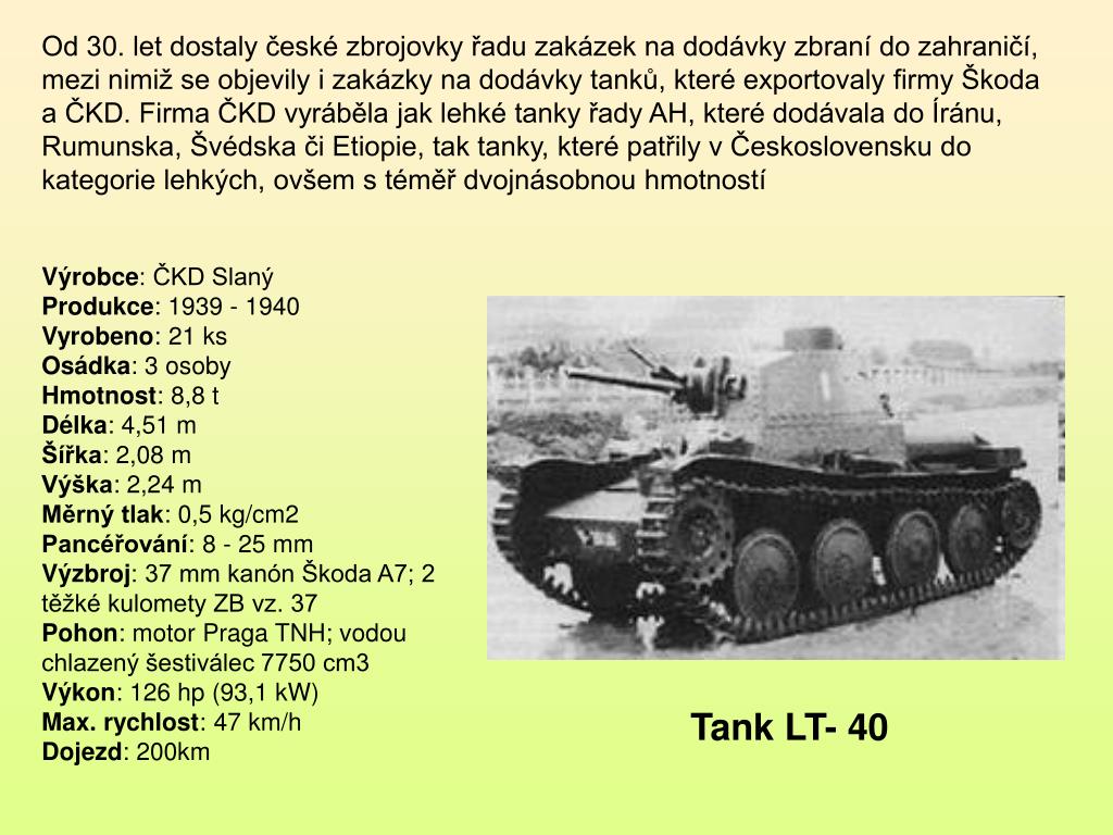 Od 30. let dostaly české zbrojovky řadu zakázek na dodávky zbraní do zahraničí, mezi nimiž se objevily i zakázky na dodávky tanků, které exportovaly firmy Škoda a ČKD. Firma ČKD vyráběla jak lehké tanky řady AH, které dodávala do Íránu, Rumunska, Švédska či Etiopie, tak tanky, které patřily v Československu do kategorie lehkých, ovšem s téměř dvojnásobnou hmotností Výrobce: ČKD Slaný Produkce: 1939 - 1940 Vyrobeno: 21 ks Osádka: 3 osoby Hmotnost: 8,8 t Délka: 4,51 m Šířka: 2,08 m Výška: 2,24 m Měrný tlak: 0,5 kg/cm2 Pancéřování: 8 - 25 mm Výzbroj: 37 mm kanón Škoda A7; 2 těžké kulomety ZB vz. 37 Pohon: motor Praga TNH; vodou chlazený šestiválec 7750 cm3 Výkon: 126 hp (93,1 kW) Max. rychlost: 47 km/h Dojezd: 200km Tank LT- 40