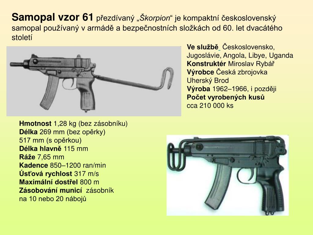 ČESKOSLOVENSKÉ ZBRANĚ. A VOJENSKÁ TECHNIKA. Z materiálů na internetu sestavil. Samopal vzor 61 přezdívaný „ Škorpion “ je kompaktní československý samopal používaný v armádě a bezpečnostních složkách od 60. let dvacátého století.