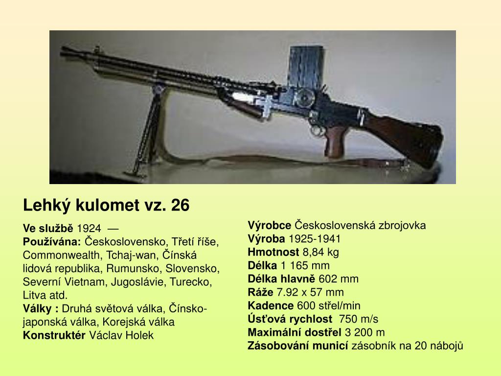 Lehký kulomet vz. 26 Ve službě 1924 — Používána: Československo, Třetí říše, Commonwealth, Tchaj-wan, Čínská lidová republika, Rumunsko, Slovensko, Severní Vietnam, Jugoslávie, Turecko, Litva atd. Války : Druhá světová válka, Čínsko-japonská válka, Korejská válka Konstruktér Václav Holek Výrobce Československá zbrojovka Výroba 1925-1941 Hmotnost 8,84 kg Délka 1 165 mm Délka hlavně 602 mm Ráže 7.92 x 57 mm Kadence 600 střel/min Úsťová rychlost 750 m/s Maximální dostřel 3 200 m Zásobování municí zásobník na 20 nábojů