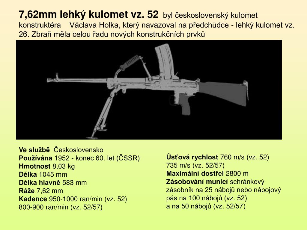 7,62mm lehký kulomet vz. 52 byl československý kulomet konstruktéra Václava Holka, který navazoval na předchůdce - lehký kulomet vz. 26. Zbraň měla celou řadu nových konstrukčních prvků Ve službě Československo Používána 1952 - konec 60. let (ČSSR) Hmotnost 8,03 kg Délka 1045 mm Délka hlavně 583 mm Ráže 7,62 mm Kadence 950-1000 ran/min (vz. 52)800-900 ran/min (vz. 52/57) Úsťová rychlost 760 m/s (vz. 52)735 m/s (vz. 52/57) Maximální dostřel 2800 m Zásobování municí schránkový zásobník na 25 nábojů nebo nábojový pás na 100 nábojů (vz. 52)a na 50 nábojů (vz. 52/57)
