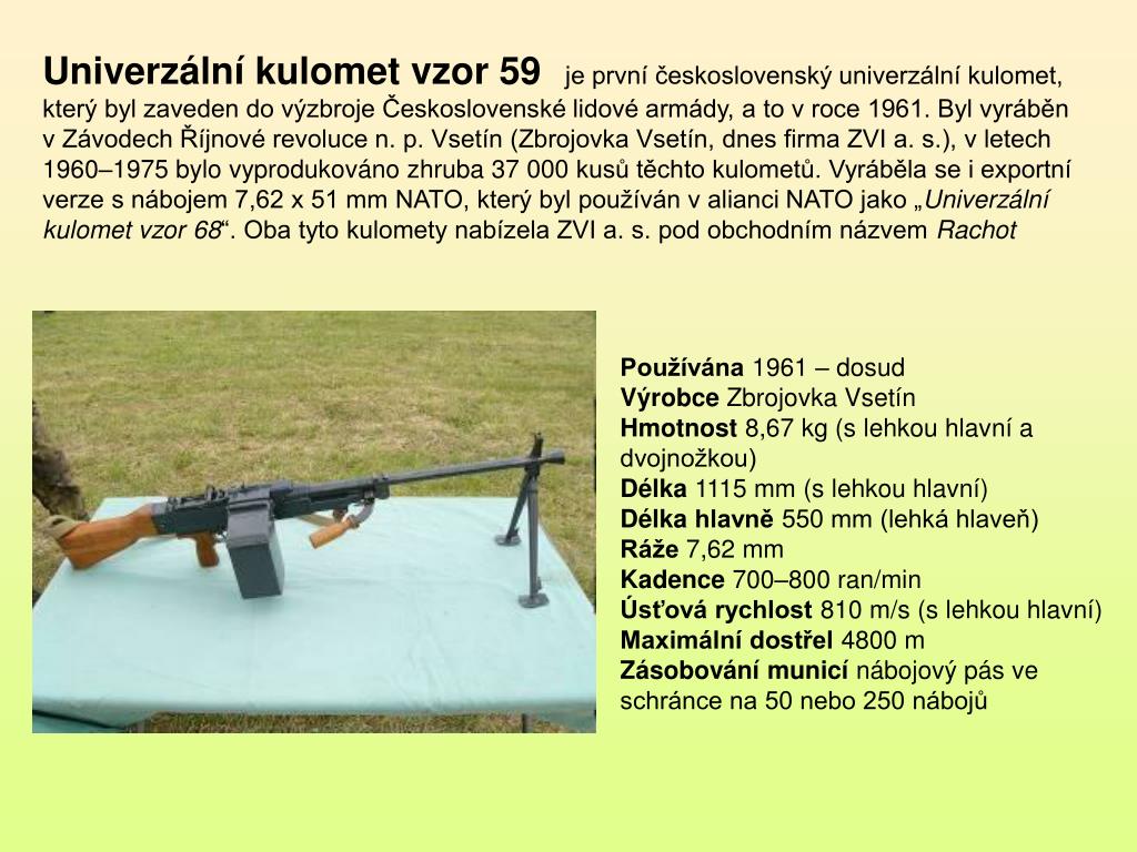 Univerzální kulomet vzor 59je první československý univerzální kulomet, který byl zaveden do výzbroje Československé lidové armády, a to v roce 1961. Byl vyráběn v Závodech Říjnové revoluce n. p. Vsetín (Zbrojovka Vsetín, dnes firma ZVI a. s.), v letech 1960–1975 bylo vyprodukováno zhruba 37 000 kusů těchto kulometů. Vyráběla se i exportní verze s nábojem 7,62 x 51 mm NATO, který byl používán v alianci NATO jako „Univerzální kulomet vzor 68“. Oba tyto kulomety nabízela ZVI a. s. pod obchodním názvem Rachot Používána 1961 – dosud Výrobce Zbrojovka Vsetín Hmotnost 8,67 kg (s lehkou hlavní a dvojnožkou) Délka 1115 mm (s lehkou hlavní) Délka hlavně 550 mm (lehká hlaveň) Ráže 7,62 mm Kadence 700–800 ran/min Úsťová rychlost 810 m/s (s lehkou hlavní) Maximální dostřel 4800 m Zásobování municí nábojový pás ve schránce na 50 nebo 250 nábojů