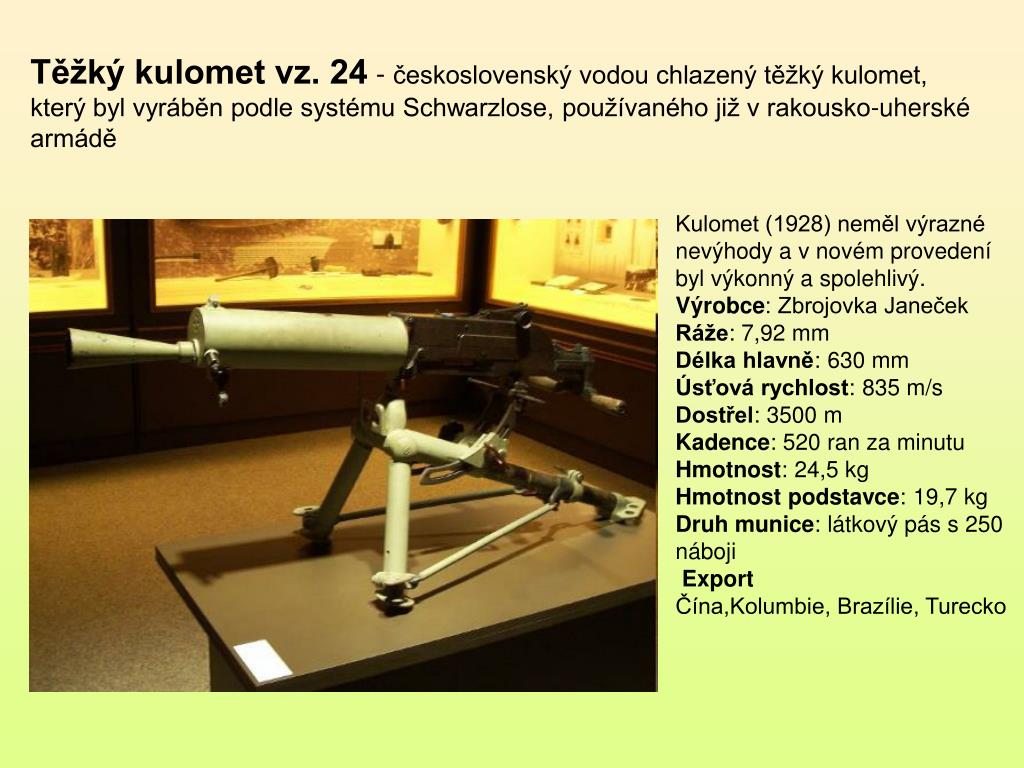 Těžký kulomet vz. 24 - československý vodou chlazený těžký kulomet, který byl vyráběn podle systému Schwarzlose, používaného již v rakousko-uherské armádě Kulomet (1928) neměl výrazné nevýhody a v novém provedení byl výkonný a spolehlivý. Výrobce: Zbrojovka Janeček Ráže: 7,92 mm Délka hlavně: 630 mm Úsťová rychlost: 835 m/s Dostřel: 3500 m Kadence: 520 ran za minutu Hmotnost: 24,5 kg Hmotnost podstavce: 19,7 kg Druh munice: látkový pás s 250 náboji Export Čína,Kolumbie, Brazílie, Turecko