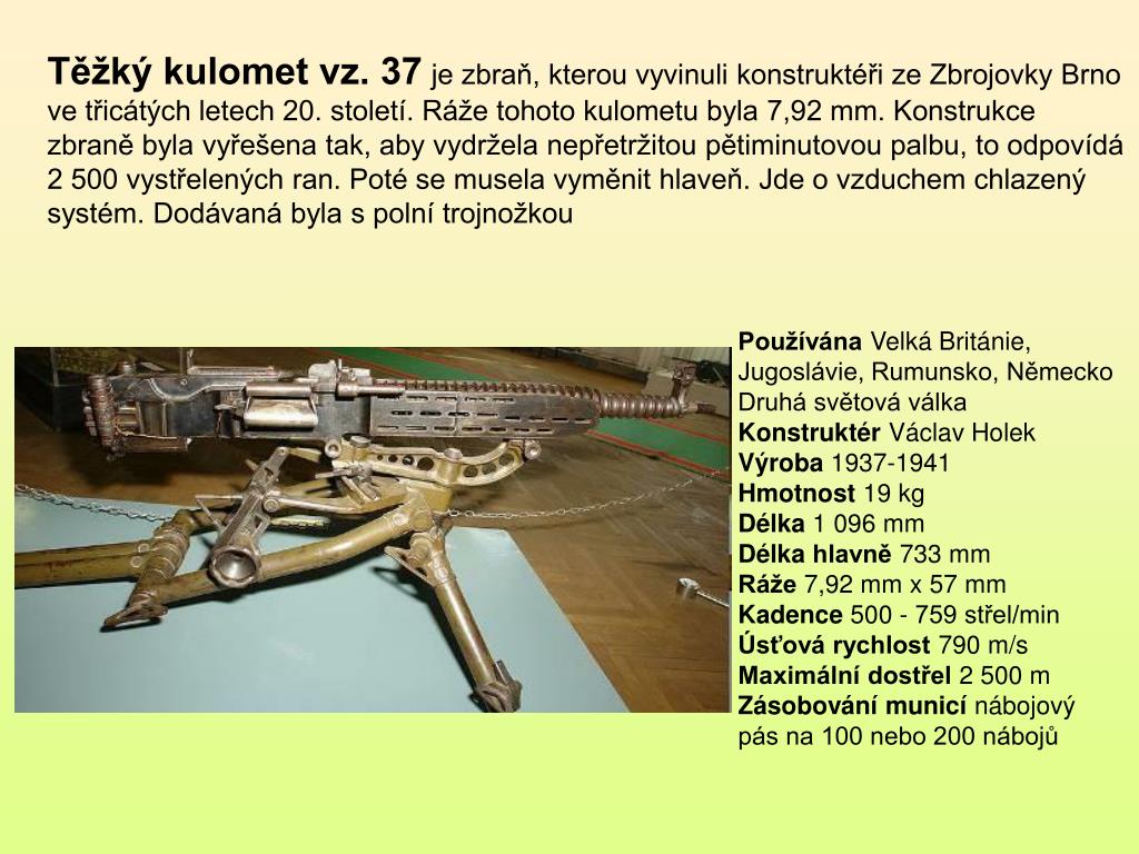 Těžký kulomet vz. 37je zbraň, kterou vyvinuli konstruktéři ze Zbrojovky Brno ve třicátých letech 20. století. Ráže tohoto kulometu byla 7,92 mm. Konstrukce zbraně byla vyřešena tak, aby vydržela nepřetržitou pětiminutovou palbu, to odpovídá 2 500 vystřelených ran. Poté se musela vyměnit hlaveň. Jde o vzduchem chlazený systém. Dodávaná byla s polní trojnožkou Používána Velká Británie, Jugoslávie, Rumunsko, NěmeckoDruhá světová válka Konstruktér Václav Holek Výroba 1937-1941 Hmotnost 19 kg Délka 1 096 mm Délka hlavně 733 mm Ráže 7,92 mm x 57 mm Kadence 500 - 759 střel/min Úsťová rychlost 790 m/s Maximální dostřel 2 500 m Zásobování municí nábojový pás na 100 nebo 200 nábojů