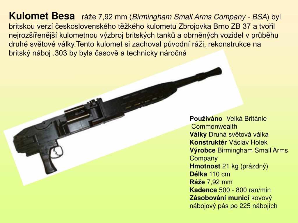 Kulomet Besa ráže 7,92 mm (Birmingham Small Arms Company - BSA) byl britskou verzí československého těžkého kulometu Zbrojovka Brno ZB 37 a tvořil nejrozšířenější kulometnou výzbroj britských tanků a obrněných vozidel v průběhu druhé světové války.Tento kulomet si zachoval původní ráži, rekonstrukce na britský náboj .303 by byla časově a technicky náročná Používáno Velká Británie Commonwealth Války Druhá světová válka Konstruktér Václav Holek Výrobce Birmingham Small Arms Company Hmotnost 21 kg (prázdný) Délka 110 cm Ráže 7,92 mm Kadence 500 - 800 ran/min Zásobování municí kovový nábojový pás po 225 nábojích