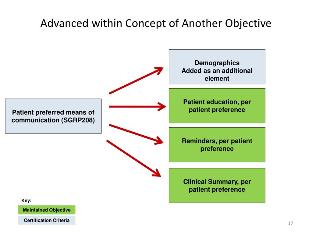 Advanced within Concept of Another Objective Demographics Added as an additional element Patient education, per patient preference Patient preferred means of communication (SGRP208) Reminders, per patient preference Clinical Summary, per patient preference Key: Maintained Objective Certification Criteria