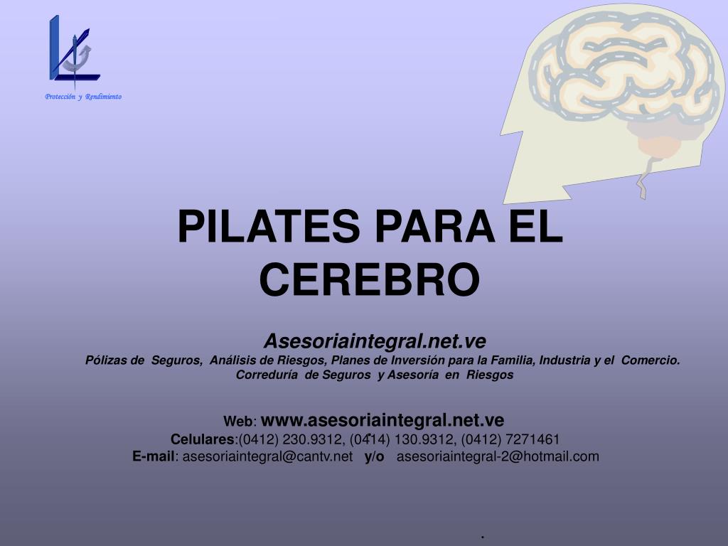 Protección y Rendimiento PILATES PARA EL CEREBRO. Asesoriaintegral.net.ve Pólizas de Seguros, Análisis de Riesgos, Planes de Inversión para la Familia, Industria y el Comercio. Correduría de Seguros y Asesoría en Riesgos Web:www.asesoriaintegral.net.ve Celulares:(0412) 230.9312, (0414) 130.9312, (0412) 7271461 E-mail: asesoriaintegral@cantv.net y/o asesoriaintegral-2@hotmail.com .
