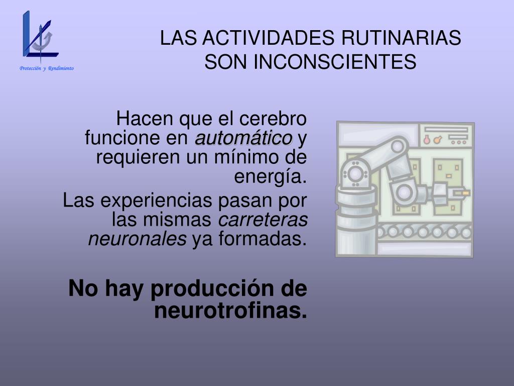 Protección y Rendimiento LAS ACTIVIDADES RUTINARIAS SON INCONSCIENTES Hacen que el cerebro funcione en automático y requieren un mínimo de energía. Las experiencias pasan por las mismas carreteras neuronales ya formadas. No hay producción de neurotrofinas.