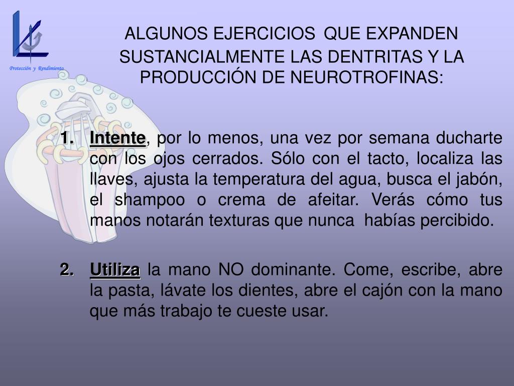 Protección y Rendimiento ALGUNOS EJERCICIOSQUE EXPANDEN SUSTANCIALMENTE LAS DENTRITAS Y LA PRODUCCIÓN DE NEUROTROFINAS: • Intente, por lo menos, una vez por semana ducharte con los ojos cerrados. Sólo con el tacto, localiza las llaves, ajusta la temperatura del agua, busca el jabón, el shampoo o crema de afeitar. Verás cómo tus manos notarán texturas que nunca habías percibido. • Utiliza la mano NO dominante. Come, escribe, abre la pasta, lávate los dientes, abre el cajón con la mano que más trabajo te cueste usar.