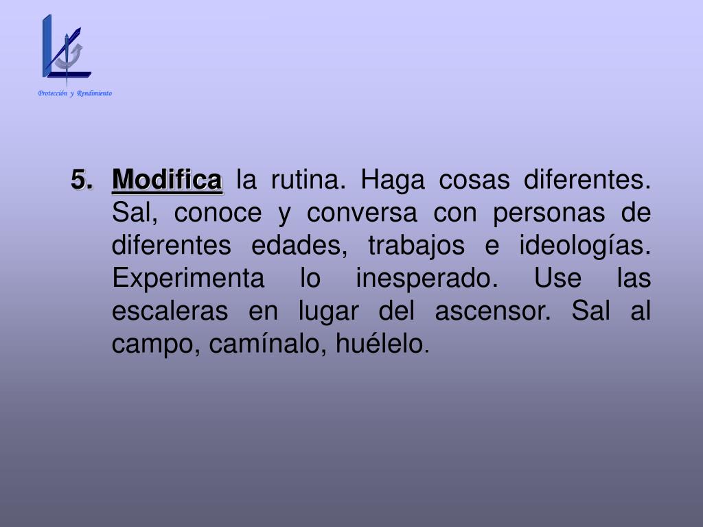 Protección y Rendimiento • Modifica la rutina. Haga cosas diferentes. Sal, conoce y conversa con personas de diferentes edades, trabajos e ideologías. Experimenta lo inesperado. Use las escaleras en lugar del ascensor. Sal al campo, camínalo, huélelo.