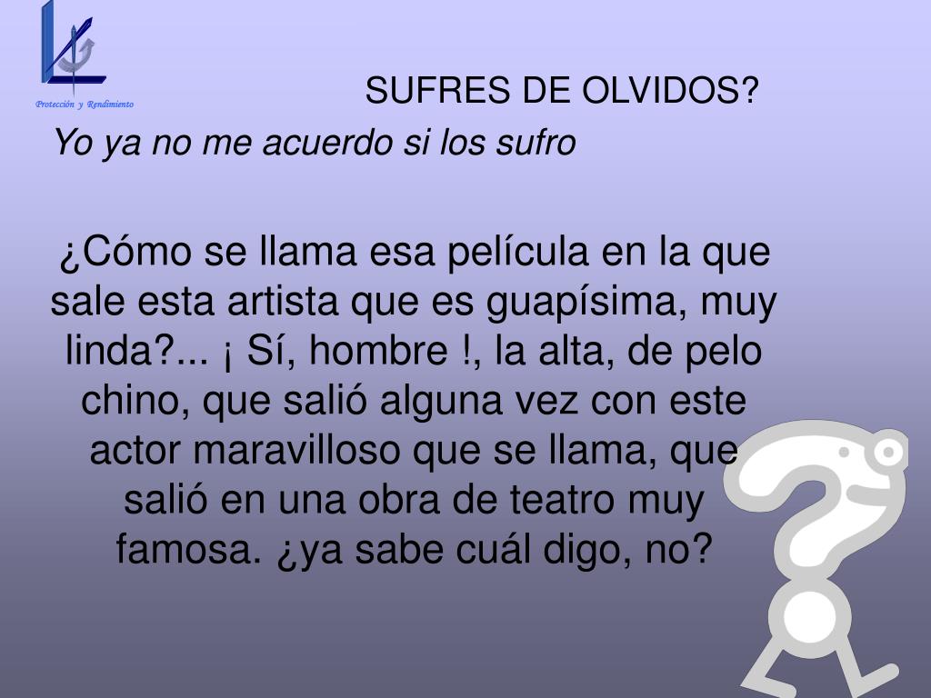 Protección y Rendimiento SUFRES DE OLVIDOS? Yo ya no me acuerdo si los sufro ¿Cómo se llama esa película en la que sale esta artista que es guapísima, muy linda?... ¡ Sí, hombre !, la alta, de pelo chino, que salió alguna vez con este actor maravilloso que se llama, que salió en una obra de teatro muy famosa. ¿ya sabe cuál digo, no?
