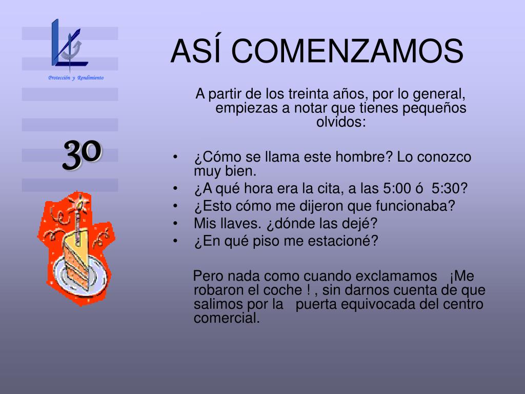 Protección y Rendimiento ASÍ COMENZAMOS A partir de los treinta años, por lo general, empiezas a notar que tienes pequeños olvidos: • ¿Cómo se llama este hombre? Lo conozco muy bien. • ¿A qué hora era la cita, a las 5:00 ó 5:30? • ¿Esto cómo me dijeron que funcionaba? • Mis llaves. ¿dónde las dejé? • ¿En qué piso me estacioné? Pero nada como cuando exclamamos ¡Me robaron el coche ! , sin darnos cuenta de que salimos por la puerta equivocada del centro comercial. 30