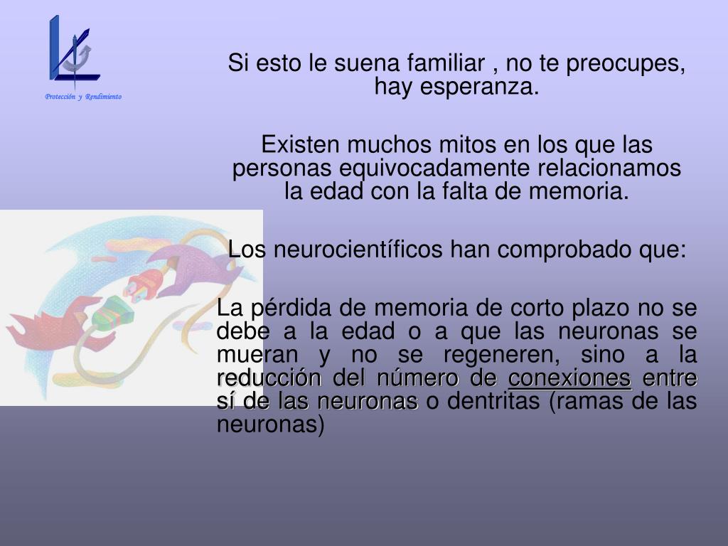 Protección y Rendimiento Si esto le suena familiar , no te preocupes, hay esperanza. Existen muchos mitos en los que las personas equivocadamente relacionamos la edad con la falta de memoria. Los neurocientíficos han comprobado que: La pérdida de memoria de corto plazo no se debe a la edad o a que las neuronas se mueran y no se regeneren, sino a la reducción del número de conexiones entre sí de las neuronas o dentritas (ramas de las neuronas)