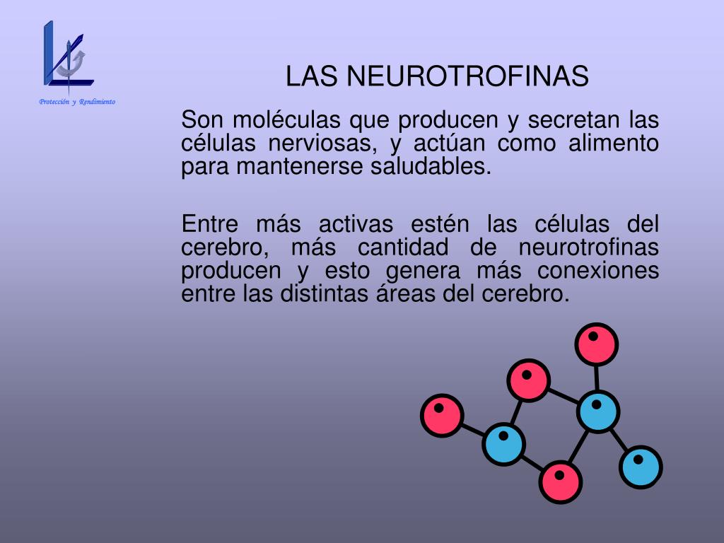 Protección y Rendimiento LAS NEUROTROFINAS Son moléculas que producen y secretan las células nerviosas, y actúan como alimento para mantenerse saludables. Entre más activas estén las células del cerebro, más cantidad de neurotrofinas producen y esto genera más conexiones entre las distintas áreas del cerebro.