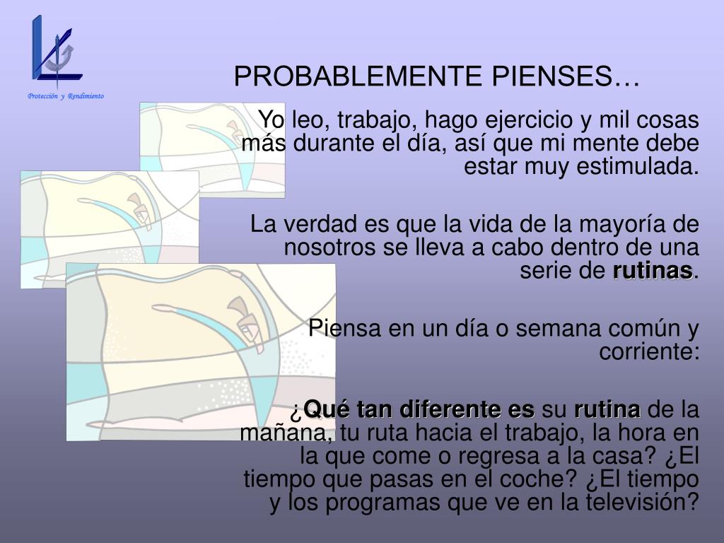 Protección y Rendimiento PROBABLEMENTE PIENSES… Yo leo, trabajo, hago ejercicio y mil cosas más durante el día, así que mi mente debe estar muy estimulada. La verdad es que la vida de la mayoría de nosotros se lleva a cabo dentro de una serie de rutinas. Piensa en un día o semana común y corriente: ¿Qué tan diferente es su rutina de la mañana, tu ruta hacia el trabajo, la hora en la que come o regresa a la casa? ¿El tiempo que pasas en el coche? ¿El tiempo y los programas que ve en la televisión?