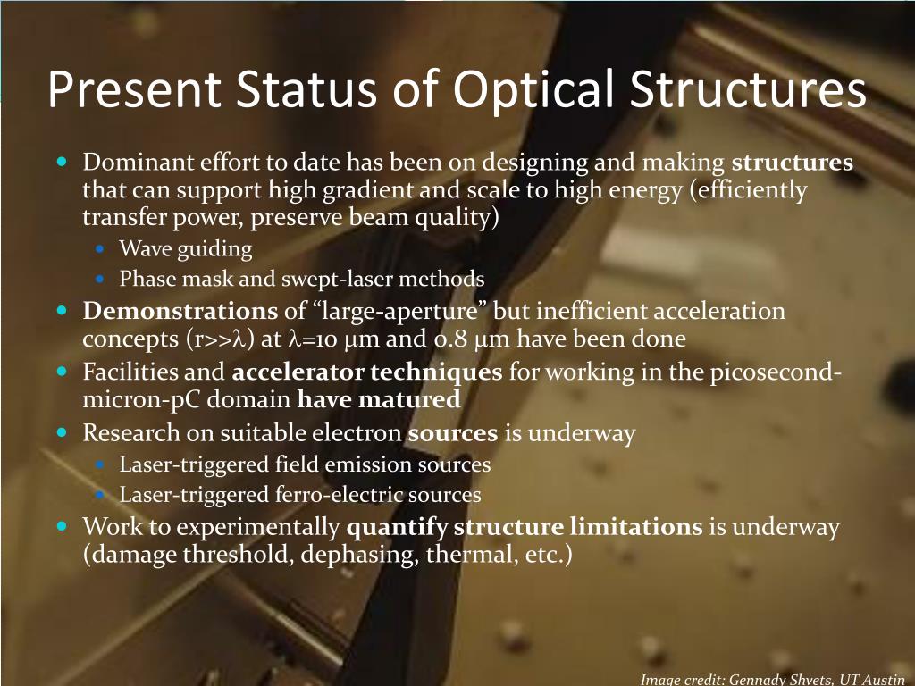 Present Status of Optical Structures • Dominant effort to date has been on designing and making structures that can support high gradient and scale to high energy (efficiently transfer power, preserve beam quality) • Wave guiding • Phase mask and swept-laser methods • Demonstrations of “large-aperture” but inefficient acceleration concepts (r>>l) at l=10 mm and 0.8 mm have been done • Facilities and accelerator techniques for working in the picosecond-micron-pC domain have matured • Research on suitable electron sources is underway • Laser-triggered field emission sources • Laser-triggered ferro-electric sources • Work to experimentally quantify structure limitations is underway (damage threshold, dephasing, thermal, etc.) Image credit: Gennady Shvets, UT Austin