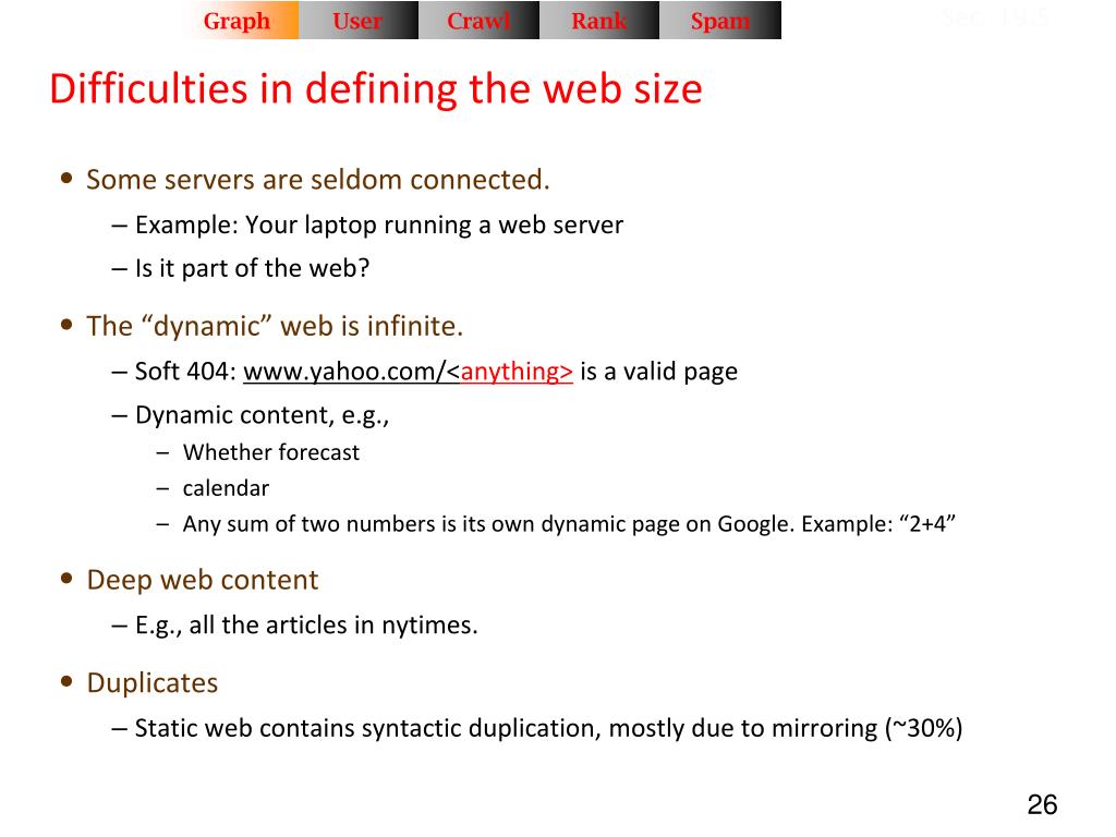 Sec. 19.5 Difficulties in defining the web size Some servers are seldom connected. Example: Your laptop running a web server Is it part of the web? The “dynamic” web is infinite. Soft 404: www.yahoo.com/<anything> is a valid page Dynamic content, e.g., Whether forecast calendar Any sum of two numbers is its own dynamic page on Google. Example: “2+4” Deep web content E.g., all the articles in nytimes. Duplicates Static web contains syntactic duplication, mostly due to mirroring (~30%) Graph User Crawl Rank Spam