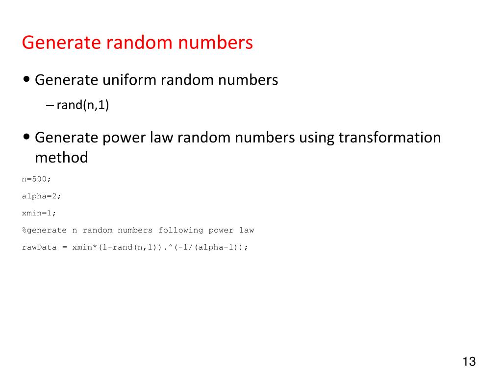 Generate random numbers • Generate uniform random numbers • rand(n,1) • Generate power law random numbers using transformation method n=500; alpha=2; xmin=1; %generate n random numbers following power law rawData = xmin*(1-rand(n,1)).^(-1/(alpha-1));