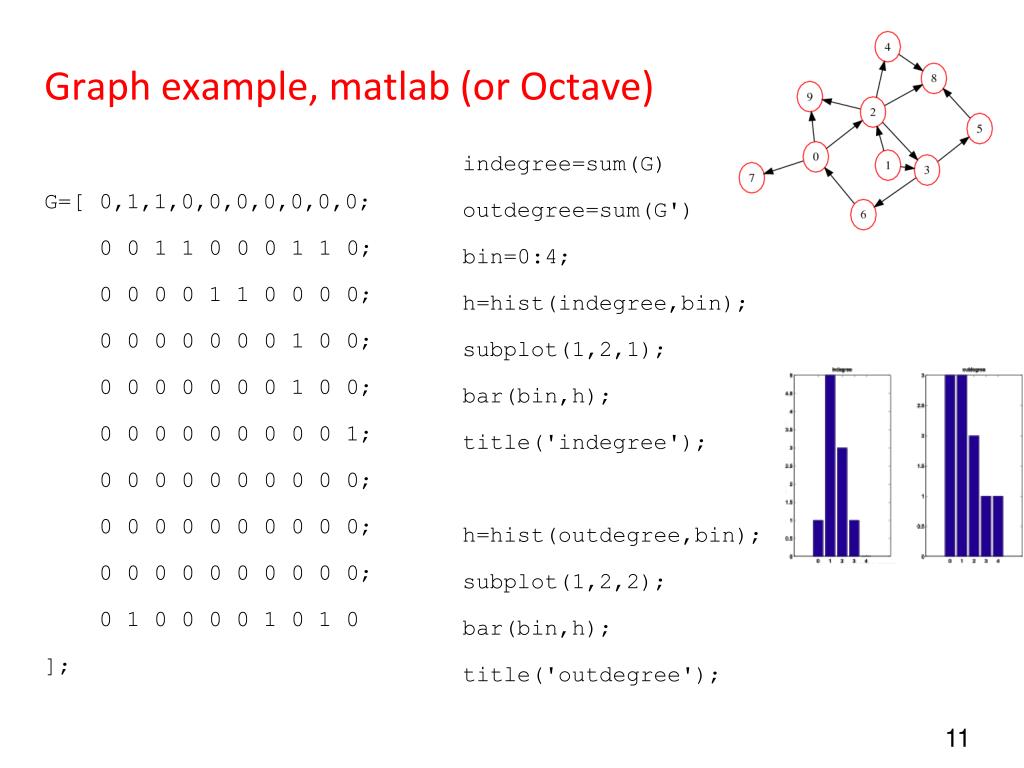 Graph example, matlab (or Octave) G=[ 0,1,1,0,0,0,0,0,0,0; 0 0 1 1 0 0 0 1 1 0; 0 0 0 0 1 1 0 0 0 0; 0 0 0 0 0 0 0 1 0 0; 0 0 0 0 0 0 0 1 0 0; 0 0 0 0 0 0 0 0 0 1; 0 0 0 0 0 0 0 0 0 0; 0 0 0 0 0 0 0 0 0 0; 0 0 0 0 0 0 0 0 0 0; 0 1 0 0 0 0 1 0 1 0 ]; indegree=sum(G) outdegree=sum(G') bin=0:4; h=hist(indegree,bin); subplot(1,2,1); bar(bin,h); title('indegree'); h=hist(outdegree,bin); subplot(1,2,2); bar(bin,h); title('outdegree');