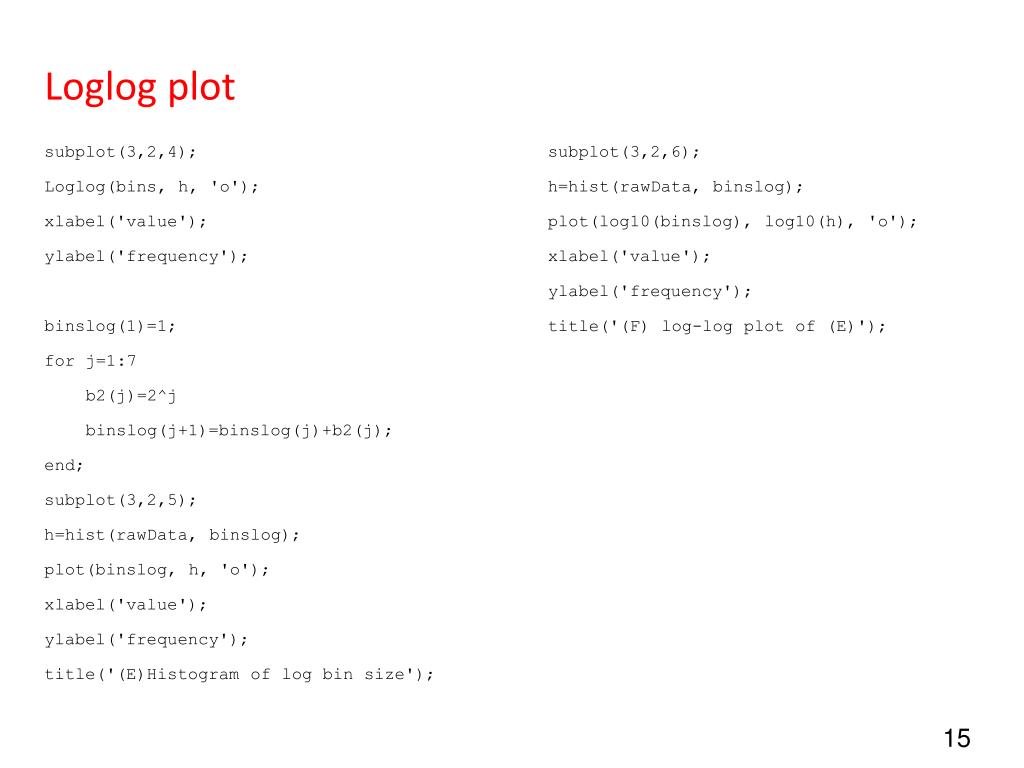 Loglog plot subplot(3,2,4); Loglog(bins, h, 'o'); xlabel('value'); ylabel('frequency'); binslog(1)=1; for j=1:7 b2(j)=2^j binslog(j+1)=binslog(j)+b2(j); end; subplot(3,2,5); h=hist(rawData, binslog); plot(binslog, h, 'o'); xlabel('value'); ylabel('frequency'); title('(E)Histogram of log bin size'); subplot(3,2,6); h=hist(rawData, binslog); plot(log10(binslog), log10(h), 'o'); xlabel('value'); ylabel('frequency'); title('(F) log-log plot of (E)');
