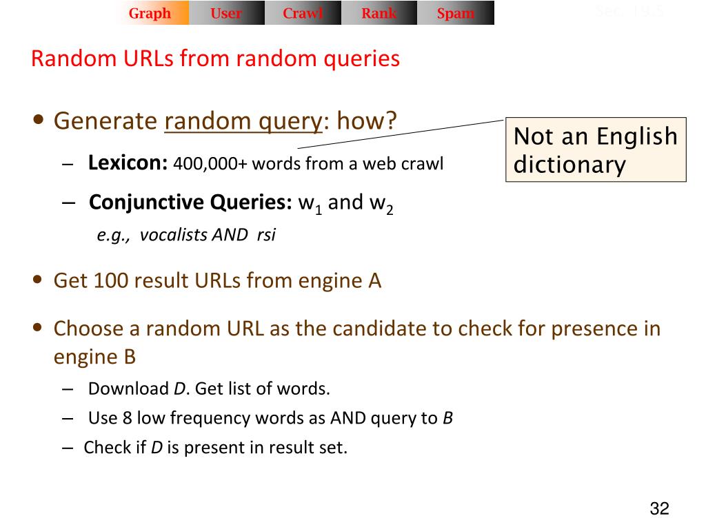 Sec. 19.5 Random URLs from random queries Generate random query: how? Lexicon:400,000+ words from a web crawl Conjunctive Queries: w1 and w2 e.g., vocalists AND rsi Get 100 result URLs from engine A Choose a random URL as the candidate to check for presence in engine B Download D. Get list of words. Use 8 low frequency words as AND query to B Check if D is present in result set. Graph User Crawl Rank Spam Not an English dictionary