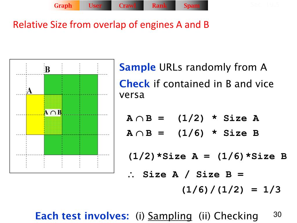 Sec. 19.5 Relative Size from overlap of engines A and B Graph User Crawl Rank Spam AÇB SampleURLs randomly from A Check if contained in B and vice versa AÇ B= (1/2) * Size A AÇ B= (1/6) * Size B (1/2)*Size A = (1/6)*Size B \ Size A / Size B = (1/6)/(1/2) = 1/3 Each test involves: (i) Sampling (ii) Checking