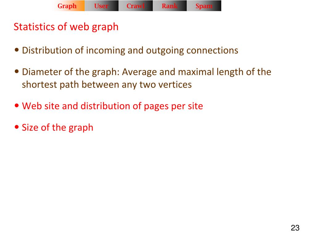 Graph User Crawl Rank Spam Statistics of web graph • Distribution of incoming and outgoing connections • Diameter of the graph: Average and maximal length of the shortest path between any two vertices • Web site and distribution of pages per site • Size of the graph