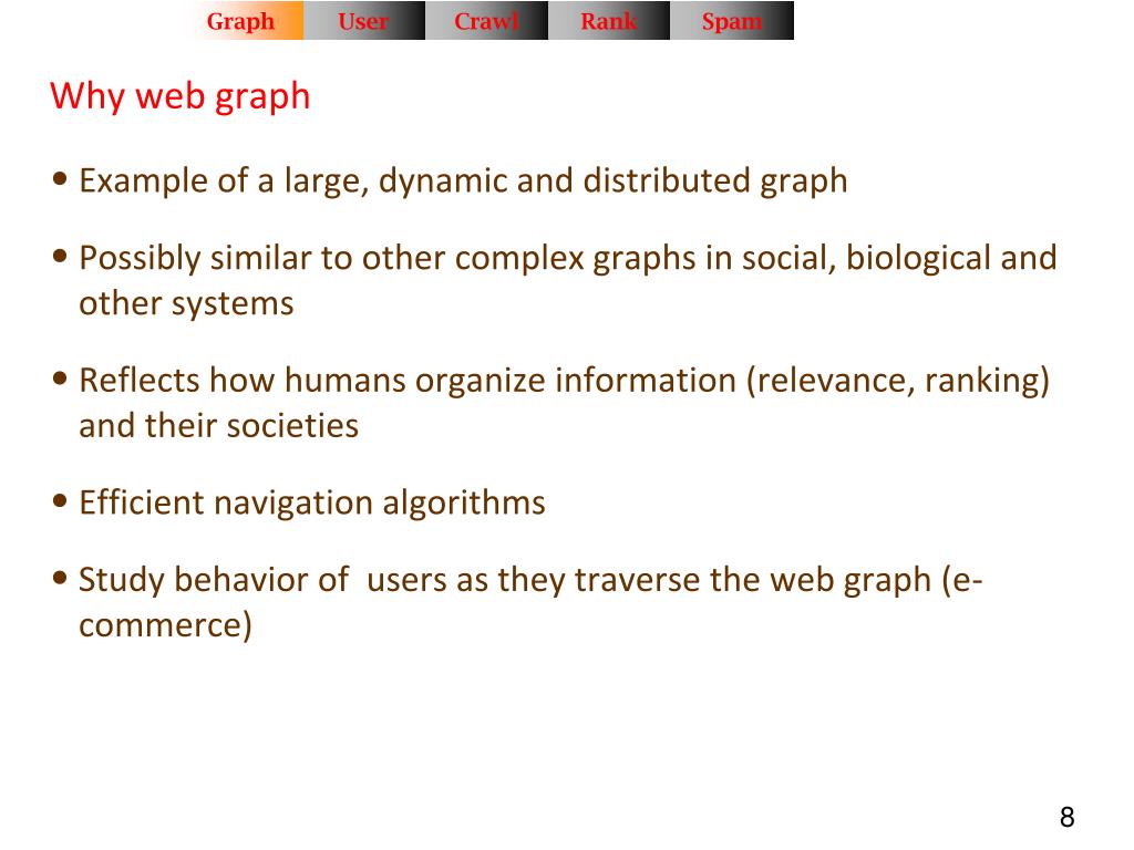 Graph User Crawl Rank Spam Why web graph • Example of a large, dynamic and distributed graph • Possibly similar to other complex graphs in social, biological and other systems • Reflects how humans organize information (relevance, ranking) and their societies • Efficient navigation algorithms • Study behavior of users as they traverse the web graph (e-commerce)