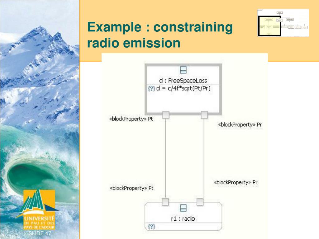 Parametric Diagrams • To express constraints between value properties • equations • support for engineering analysis (e.g., performance) • identification of critical performance properties • Constraint block captures equations • Expression language can be formal (e.g., MathML, OCL) • Computational engine is not provided by SysML • Parametric diagram • usage of the constraints in an analysis context SLIDE 44