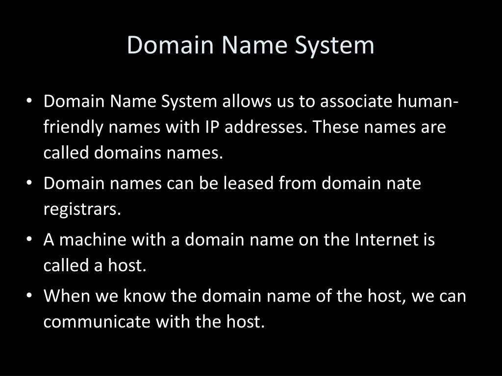 Domain Name System • Domain Name System allows us to associate human-friendly names with IP addresses. These names are called domains names. • Domain names can be leased from domain nate registrars. • A machine with a domain name on the Internet is called a host. • When we know the domain name of the host, we can communicate with the host.