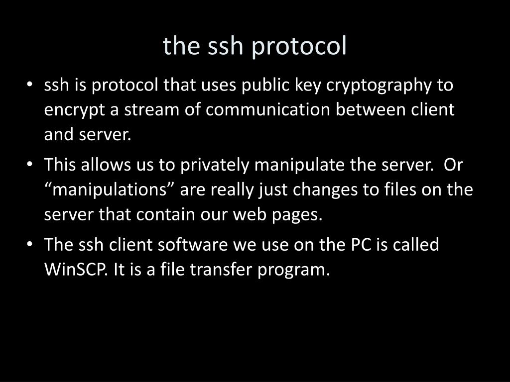 the ssh protocol • ssh is protocol that uses public key cryptography to encrypt a stream of communication between client and server. • This allows us to privately manipulate the server. Or “manipulations” are really just changes to files on the server that contain our web pages. • The ssh client software we use on the PC is called WinSCP. It is a file transfer program.