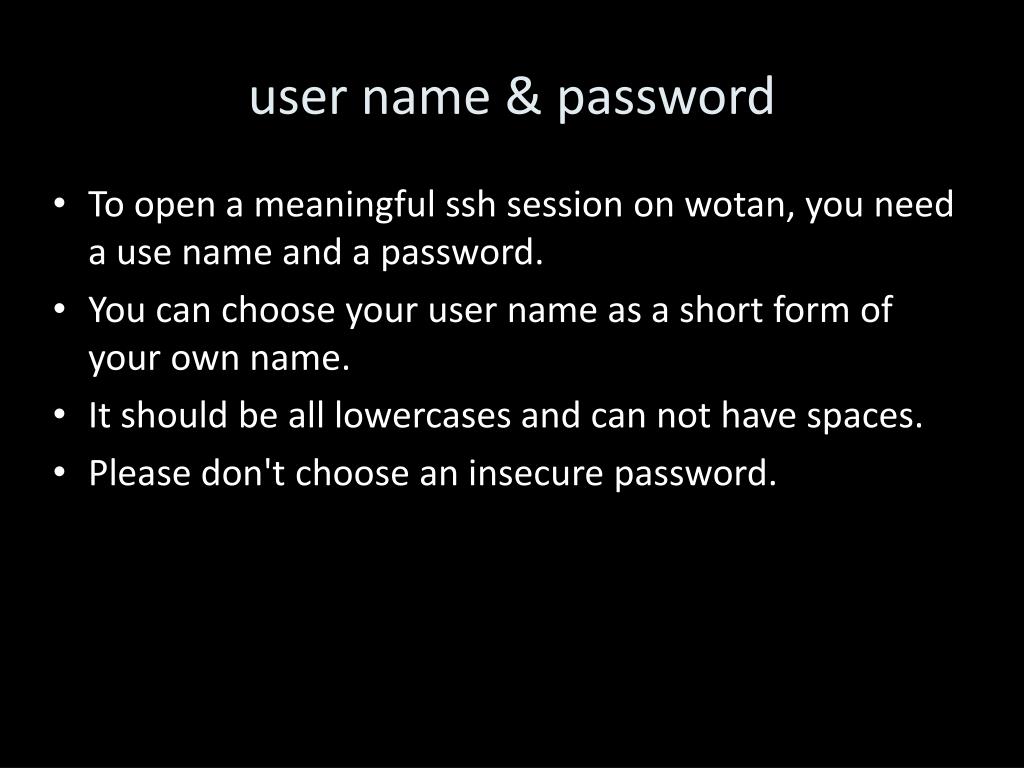 user name & password • To open a meaningful ssh session on wotan, you need a use name and a password. • You can choose your user name as a short form of your own name. • It should be all lowercases and can not have spaces. • Please don't choose an insecure password.