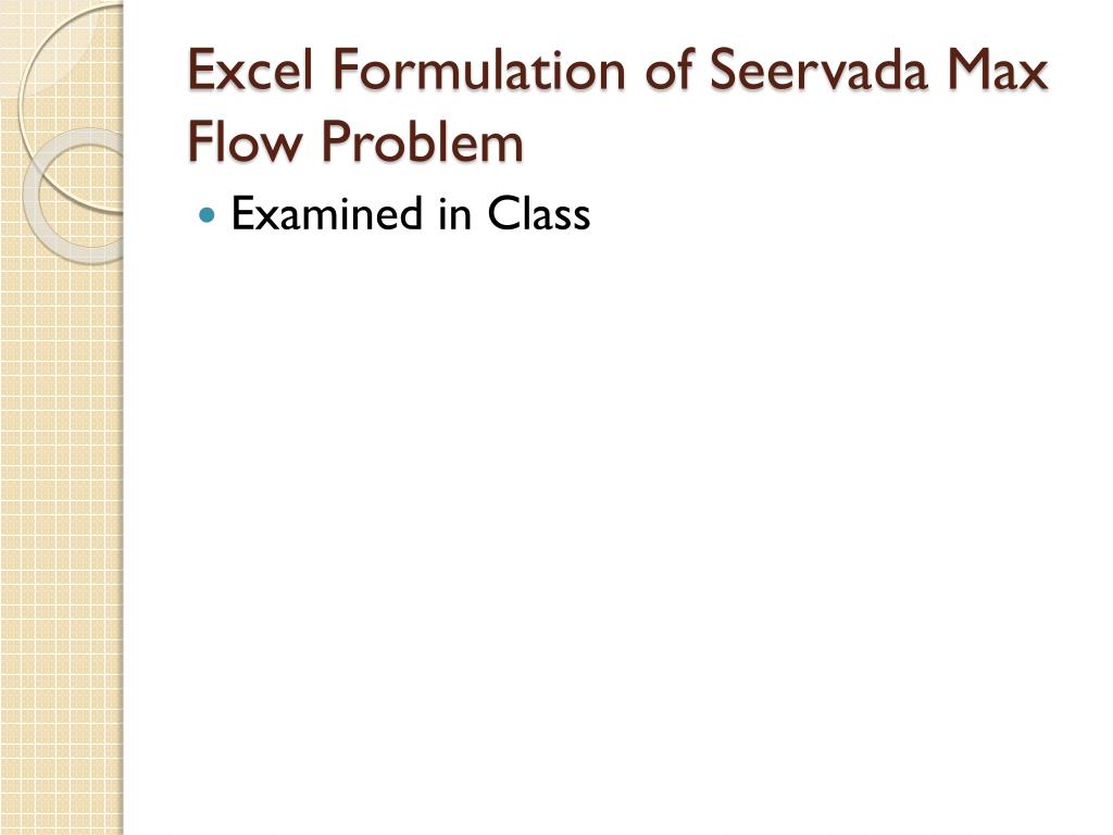 Excel Formulation of Seervada Max Flow Problem • Examined in Class