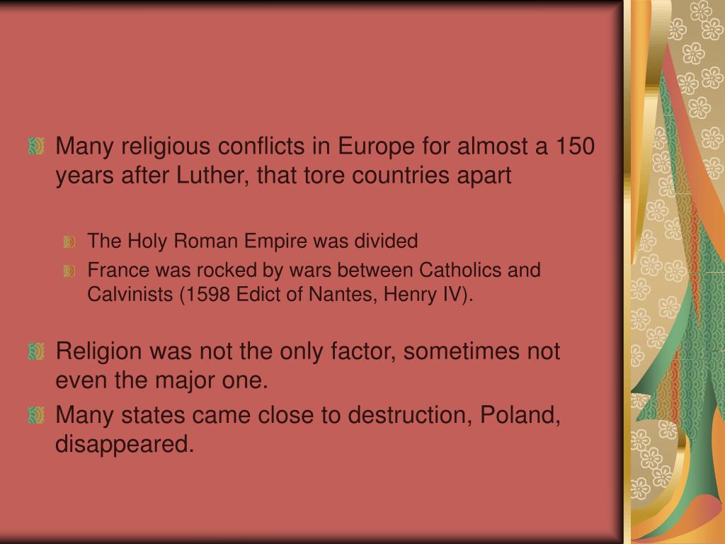 Many religious conflicts in Europe for almost a 150 years after Luther, that tore countries apart • The Holy Roman Empire was divided • France was rocked by wars between Catholics and Calvinists (1598 Edict of Nantes, Henry IV). • Religion was not the only factor, sometimes not even the major one. • Many states came close to destruction, Poland, disappeared.