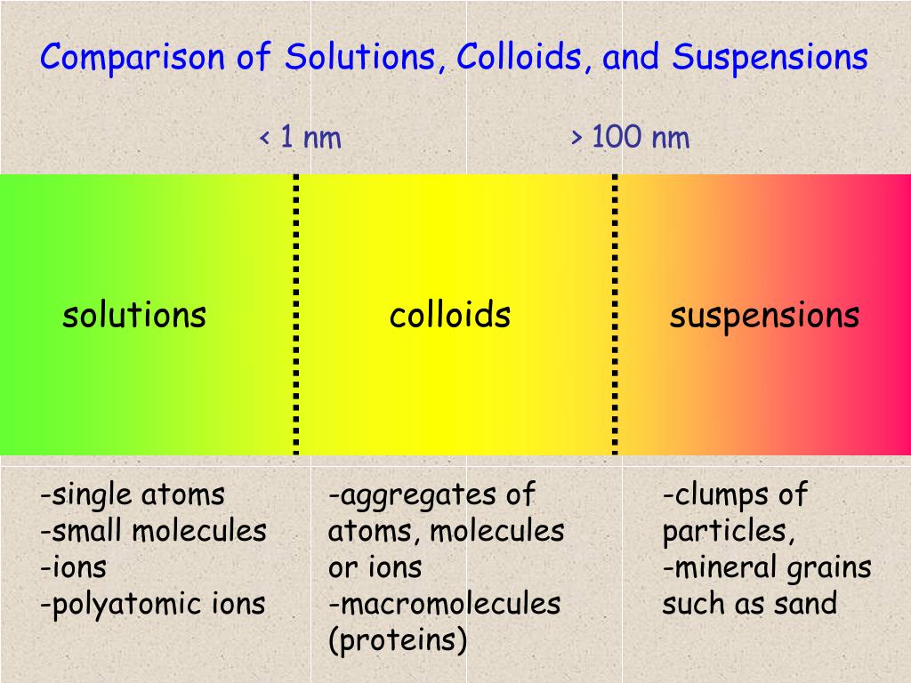 < 1 nm > 100 nm solutions colloids suspensions Comparison of Solutions, Colloids, and Suspensions -single atoms -small molecules -ions -polyatomic ions -aggregates of atoms, molecules or ions -macromolecules (proteins) -clumps of particles, -mineral grains such as sand