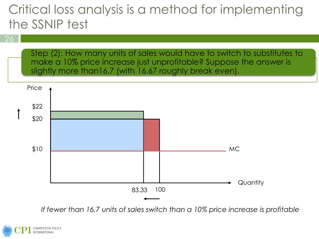 Critical loss analysis is a method for implementing the SSNIP test Price $22 $20 $10 MC Quantity 100 83.33 If fewer than 16.7 units of sales switch than a 10% price increase is profitable