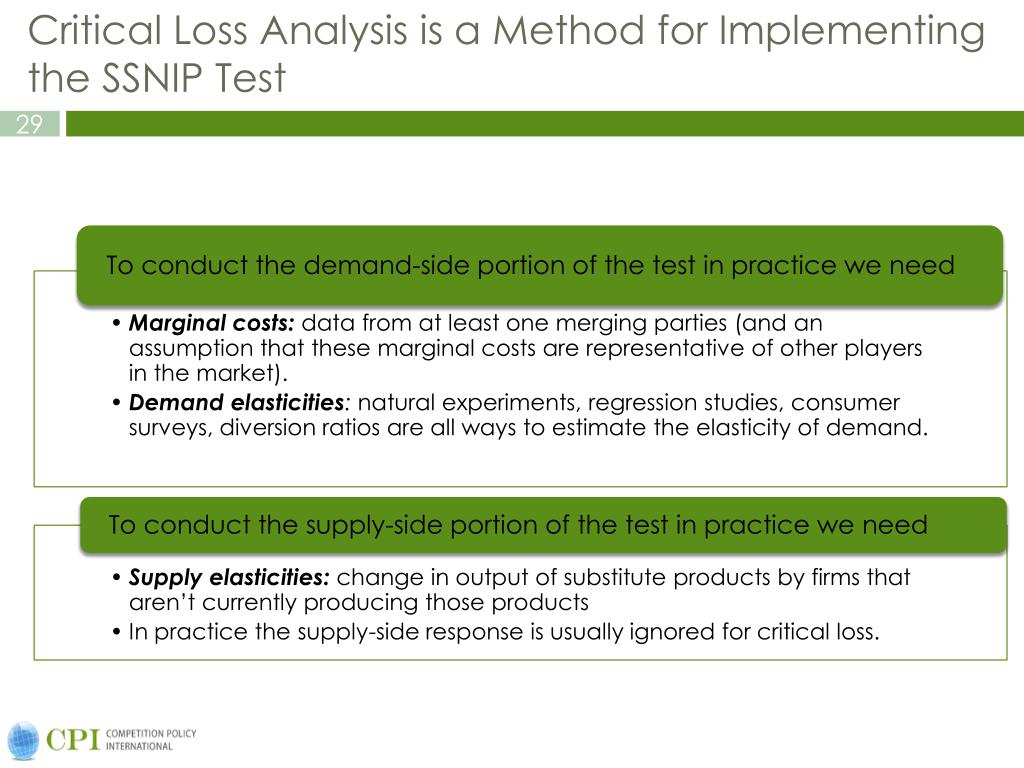 Critical Loss Analysis is a Method for Implementing the SSNIP Test Price $22 $20 Dmore elastic $10 MC Dimplied by critical loss Dmore inelastic Quantity 100 83.33 Regression analyses, natural experiments, and internal market studies can help determine actual loss.