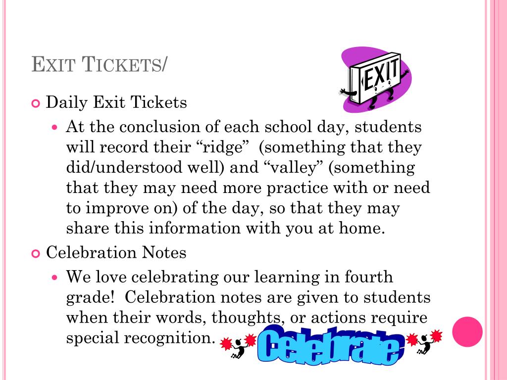 Exit Tickets/ • Daily Exit Tickets • At the conclusion of each school day, students will record their “ridge” (something that they did/understood well) and “valley” (something that they may need more practice with or need to improve on) of the day, so that they may share this information with you at home. • Celebration Notes • We love celebrating our learning in fourth grade! Celebration notes are given to students when their words, thoughts, or actions require special recognition. Celebrate