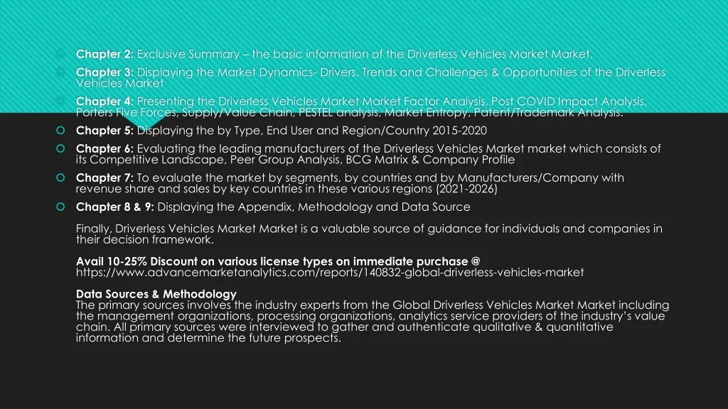 Chapter 2: Exclusive Summary – the basic information of the Driverless Vehicles Market Market. • Chapter 3: Displayingthe Market Dynamics- Drivers, Trends and Challenges & Opportunities of the Driverless Vehicles Market • Chapter 4: Presenting the Driverless Vehicles Market Market Factor Analysis, Post COVID Impact Analysis, Porters Five Forces, Supply/Value Chain, PESTEL analysis, Market Entropy, Patent/Trademark Analysis. • Chapter 5: Displaying the by Type, End User and Region/Country 2015-2020 • Chapter 6: Evaluating the leading manufacturers of the Driverless Vehicles Market market which consists of its Competitive Landscape, Peer Group Analysis, BCG Matrix & Company Profile • Chapter 7: To evaluate the market by segments, by countries and by Manufacturers/Company with revenue share and sales by key countries in these various regions (2021-2026) • Chapter 8 & 9: Displaying the Appendix, Methodology and Data SourceFinally, Driverless Vehicles Market Market is a valuable source of guidance for individuals and companies in their decision framework.Avail 10-25% Discount on various license types on immediate purchase @ https://www.advancemarketanalytics.com/reports/140832-global-driverless-vehicles-marketData Sources & MethodologyThe primary sources involves the industry experts from the Global Driverless Vehicles Market Market including the management organizations, processing organizations, analytics service providers of the industry’s value chain. All primary sources were interviewed to gather and authenticate qualitative & quantitative information and determine the future prospects.