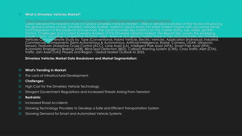 What is Driverless Vehicles Market?https://www.advancemarketanalytics.com/reports/140832-global-driverless-vehicles-marketLatest released the research study on Global Driverless Vehicles Market , offers a detailed overview of the factors influencing the global business scope. Driverless Vehicles Market research report shows the latest market insights with upcoming trends and breakdown of the products and services. The report provides key statistics on the market status, size, share, growth factors, Challenges and Current Scenario Analysis of the Driverless Vehicles Market. This Report also covers the emerging player’s data, including: competitive situation, sales, revenue and global market share of top manufacturers are Driverless Vehicles Comprehensive Study by Type (Conventional, Hybrid Vehicle, Electric Vehicle), Application (Individual, Industrial, Commercial), Components (Semi-Autonomous & Autonomous, Artificial Intelligence, Radar, Camera, LIDAR, Ultrasonic Sensor), Features (Adaptive Cruise Control (ACC), Lane Assist (LA), Intelligent Park Assist (APA), Smart Park Assist (SPA), Automatic Emergency Braking (AEB), Blind Spot Detection (BSD), Collision Warning System (CWS), Cross Traffic Alert (CTA), Traffic Jam Assist (TJA)) Players and Region - Global Market Outlook to 2025.Driverless Vehicles Market Data Breakdown and Market Segmentation: • What's Trending in Market: • The Lack of Infrastructural Development • Challenges: • High Cost for the Driverless Vehicle Technology • Stringent Government Regulations and Increased Threats Arising From Terrorism • Restraints: • Increased Road Accidents • Growing Technology Providers to Develop a Safe and Efficient Transportation System • Growing Demand for Smart and Automated Vehicle Systems