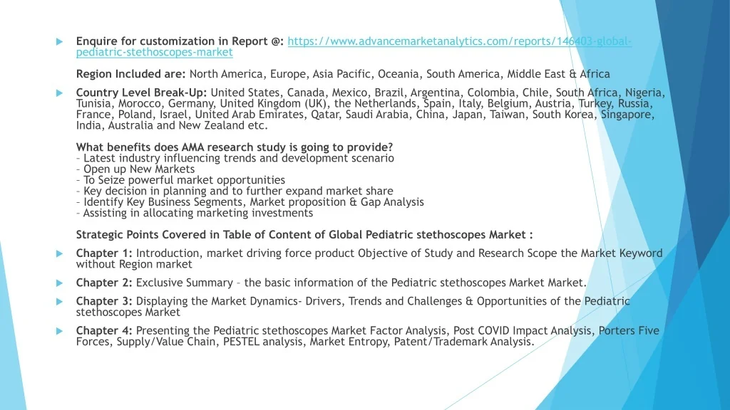 Enquire for customization in Report @: https://www.advancemarketanalytics.com/reports/146403-global-pediatric-stethoscopes-marketRegion Included are: North America, Europe, Asia Pacific, Oceania, South America, Middle East & Africa • Country Level Break-Up: United States, Canada, Mexico, Brazil, Argentina, Colombia, Chile, South Africa, Nigeria, Tunisia, Morocco, Germany, United Kingdom (UK), the Netherlands, Spain, Italy, Belgium, Austria, Turkey, Russia, France, Poland, Israel, United Arab Emirates, Qatar, Saudi Arabia, China, Japan, Taiwan, South Korea, Singapore, India, Australia and New Zealand etc.What benefits does AMA research study is going to provide?– Latest industry influencing trends and development scenario– Open up New Markets– To Seize powerful market opportunities– Key decision in planning and to further expand market share– Identify Key Business Segments, Market proposition & Gap Analysis– Assisting in allocating marketing investmentsStrategic Points Covered in Table of Content of Global Pediatric stethoscopes Market : • Chapter 1: Introduction, market driving force product Objective of Study and Research Scope the Market Keyword without Region market • Chapter 2: Exclusive Summary – the basic information of the Pediatric stethoscopes Market Market. • Chapter 3: Displayingthe Market Dynamics- Drivers, Trends and Challenges & Opportunities of the Pediatric stethoscopes Market • Chapter 4: Presenting the Pediatric stethoscopes Market Factor Analysis, Post COVID Impact Analysis, Porters Five Forces, Supply/Value Chain, PESTEL analysis, Market Entropy, Patent/Trademark Analysis.