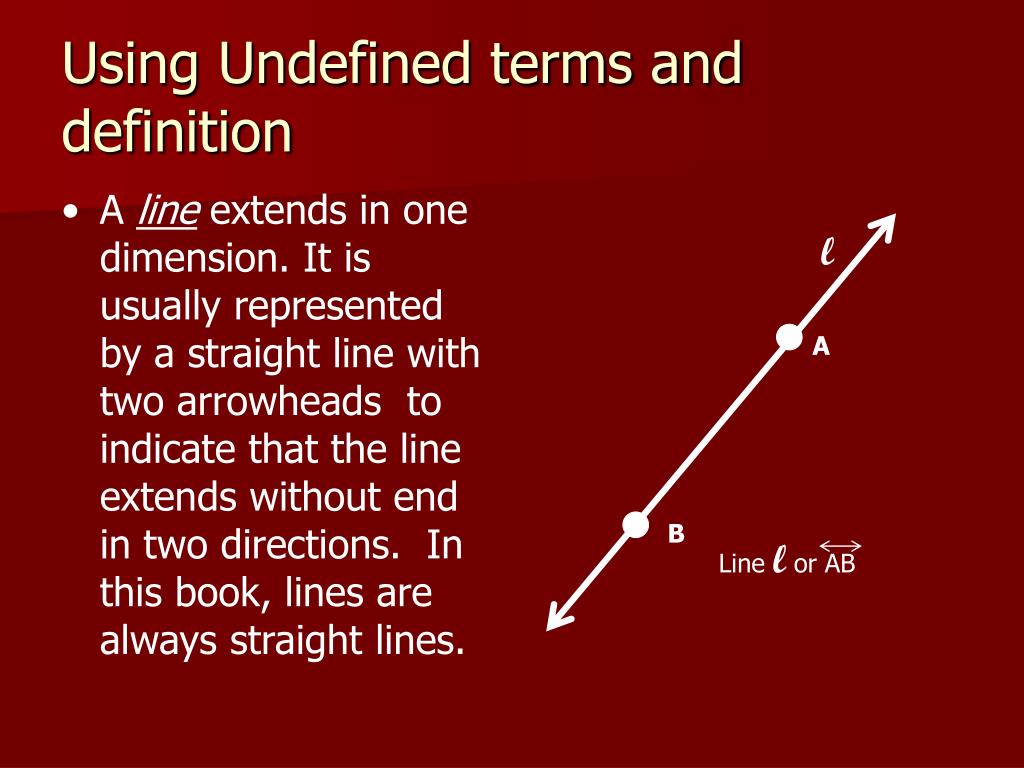 A line extends in one dimension. It is usually represented by a straight line with two arrowheads to indicate that the line extends without end in two directions. In this book, lines are always straight lines. Using Undefined terms and definition l A B Line l or AB