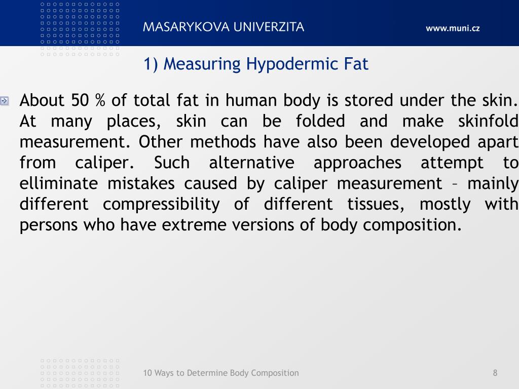 1) Measuring Hypodermic Fat • About 50 % of total fat in human body is stored under the skin. At many places, skin can be folded and make skinfold measurement. Other methods have also been developed apart from caliper. Such alternative approaches attempt to elliminate mistakes caused by caliper measurement – mainly different compressibility of different tissues, mostly with persons who have extreme versions of body composition. 10 Ways to Determine Body Composition