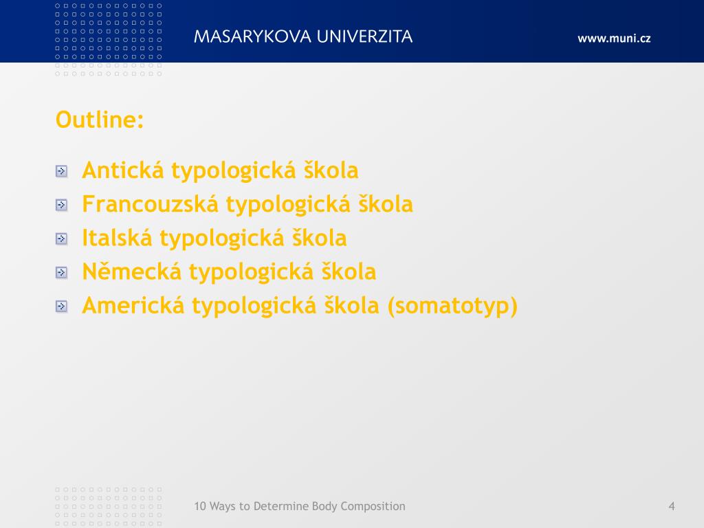 Outline: • Antická typologická škola • Francouzská typologická škola • Italská typologická škola • Německá typologická škola • Americká typologická škola (somatotyp) 10 Ways to Determine Body Composition
