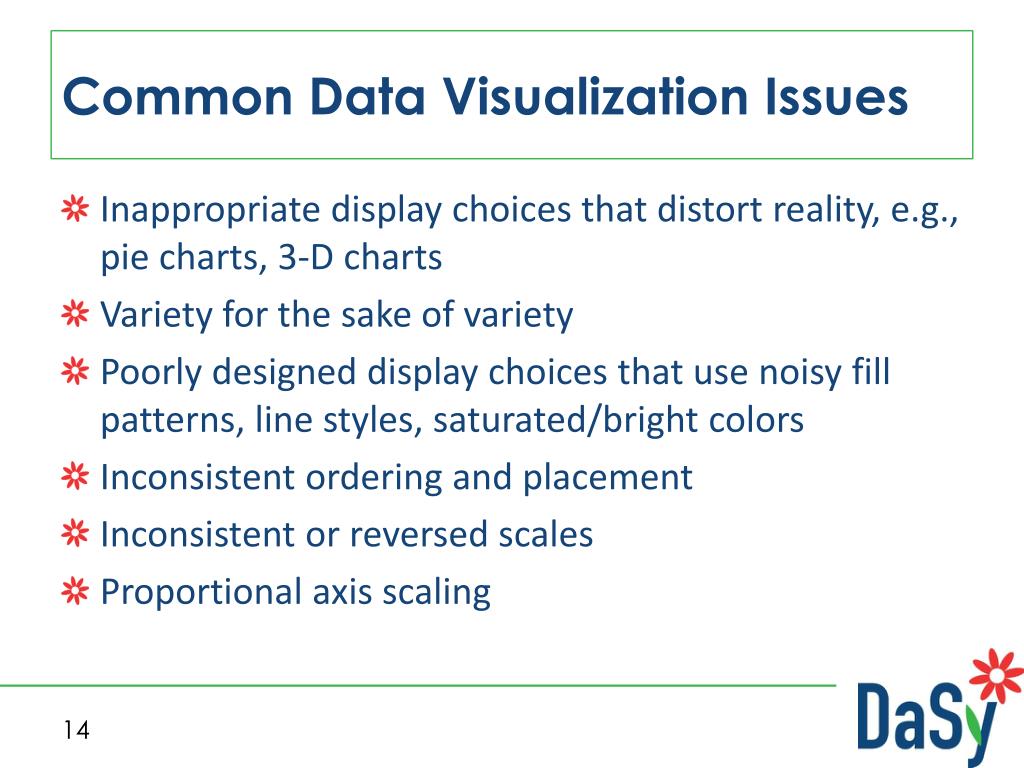Common Data Visualization Issues • Inappropriate display choices that distort reality, e.g., pie charts, 3-D charts • Variety for the sake of variety • Poorly designed display choices that use noisy fill patterns, line styles, saturated/bright colors • Inconsistent ordering and placement • Inconsistent or reversed scales • Proportional axis scaling